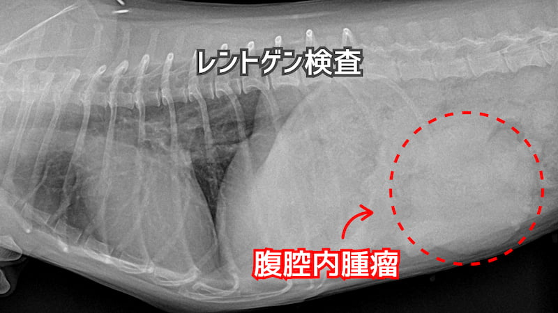 以下の写真の通り、レントゲン検査では腹部に腫瘤状の病変があることが分かります。