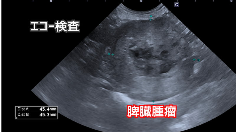 また、以下の写真の通りエコー検査では脾臓から腫瘤が発生していることが分かりました。
