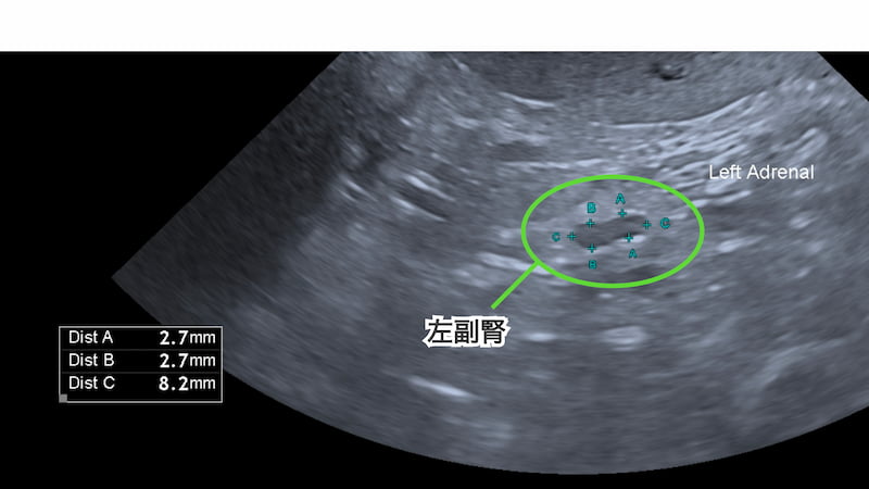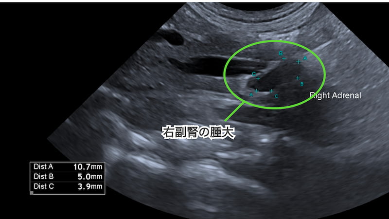 超音波検査から右副腎の腫大が確認されました。