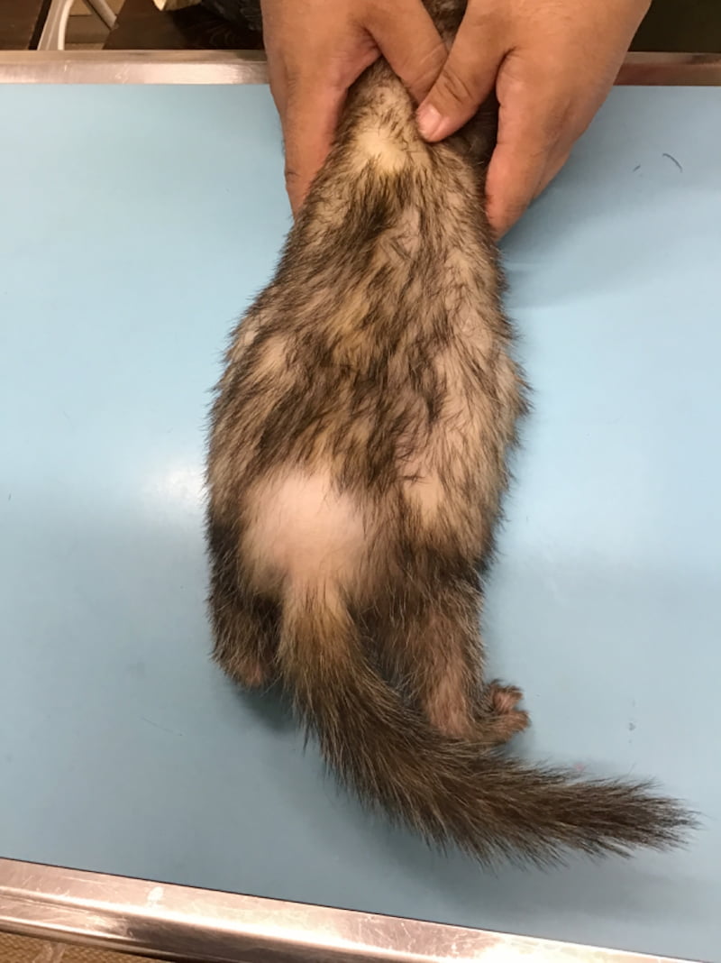 腰部尾側から起こる脱毛は最も特徴的なフェレットの副腎疾患のサインです。